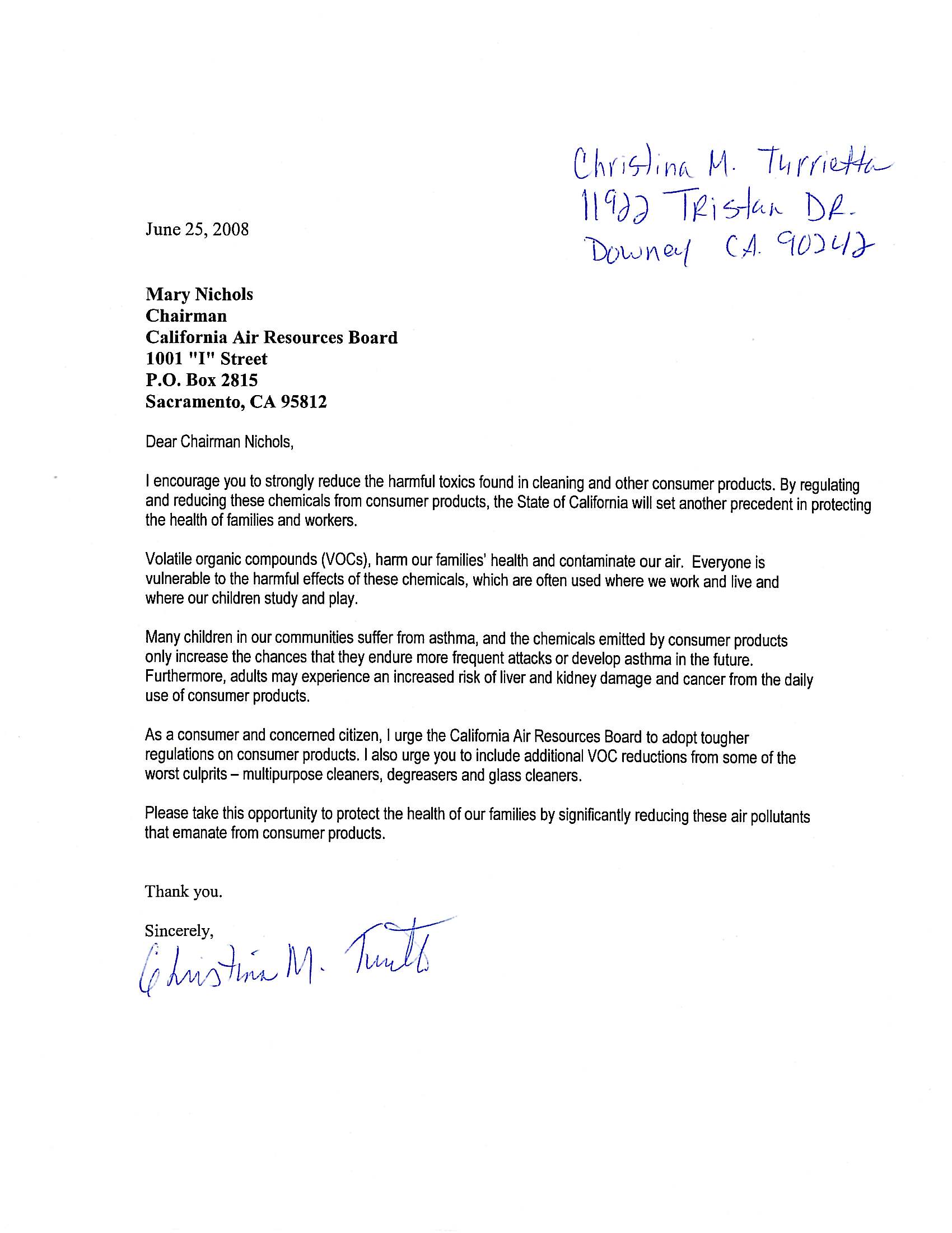 | Comment | Mary Nichols Chairman California Air Resources Board 1001 “I” Street P.O. Box 2815 Sacramento, CA 95812 Dear Chairman Nichols, I encourage you to strongly reduce the harmful toxics found in cleaning and other consumer products. By regulating and reducing these chemicals from consumer products, the State of California will set another precedent in protecting the health of families and workers. Volatile organic compounds (VOCs), harm our families’ health and contaminate our air. Everyone is vulnerable to the harmful effects of these chemicals, which are often used where we work and live and where our children study and play. Many children in our communities suffer from asthma, and the chemicals emitted by consumer products only increase the chances that they endure more frequent attacks or develop asthma in the future. Furthermore, adults may experience an increased risk of liver and kidney damage and cancer from the daily use of consumer products. As a consumer and concerned citizen, I urge the California Air Resources Board to adopt tougher regulations on consumer products. I also urge you to include additional VOC reductions from some of the worst culprits – multipurpose cleaners, degreasers and glass cleaners. Please take this opportunity to protect the health of our families by significantly reducing these air pollutants that emanate from consumer products. Thank you. |