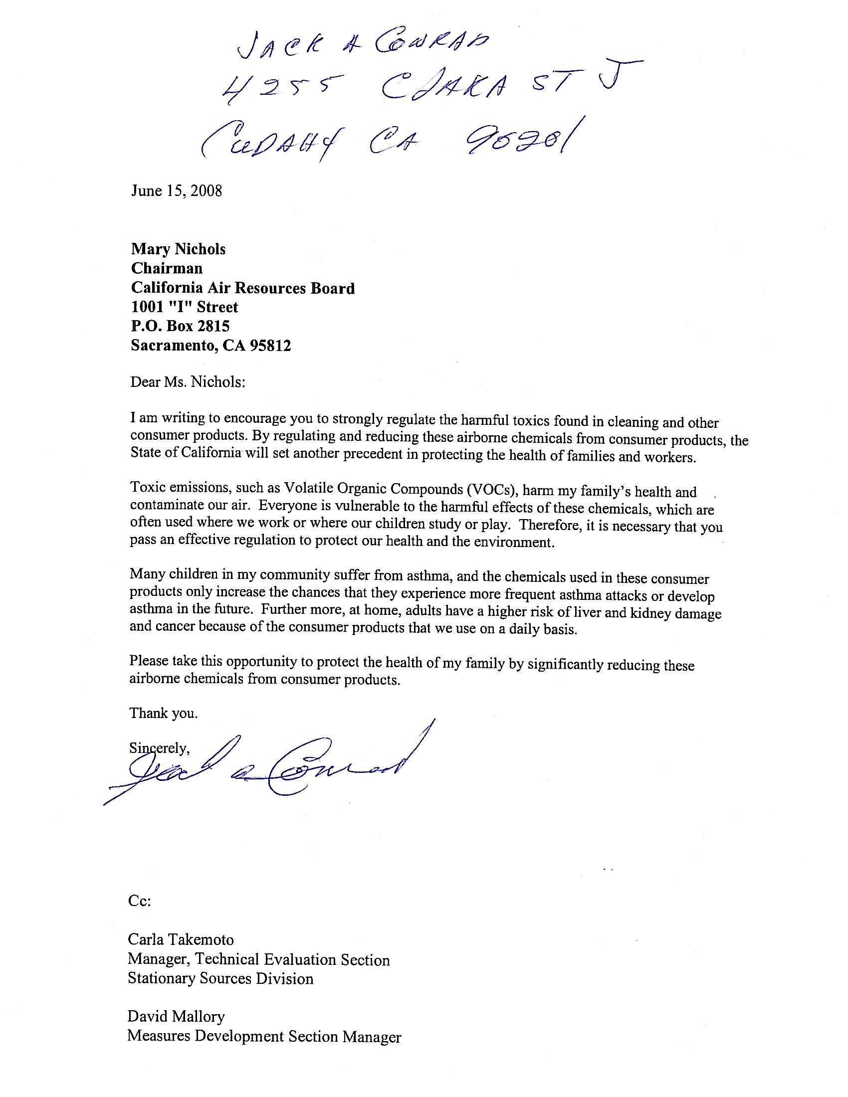 | Comment | Mary Nichols Chairman California Air Resources Board 1001 “I” Street P.O. Box 2815 Sacramento, CA 95812 Dear Chairman Nichols, I encourage you to strongly reduce the harmful toxics found in cleaning and other consumer products. By regulating and reducing these chemicals from consumer products, the State of California will set another precedent in protecting the health of families and workers. Volatile organic compounds (VOCs), harm our families’ health and contaminate our air. Everyone is vulnerable to the harmful effects of these chemicals, which are often used where we work and live and where our children study and play. Many children in our communities suffer from asthma, and the chemicals emitted by consumer products only increase the chances that they endure more frequent attacks or develop asthma in the future. Furthermore, adults may experience an increased risk of liver and kidney damage and cancer from the daily use of consumer products. As a consumer and concerned citizen, I urge the California Air Resources Board to adopt tougher regulations on consumer products. I also urge you to include additional VOC reductions from some of the worst culprits – multipurpose cleaners, degreasers and glass cleaners. Please take this opportunity to protect the health of our families by significantly reducing these air pollutants that emanate from consumer products. Thank you. |