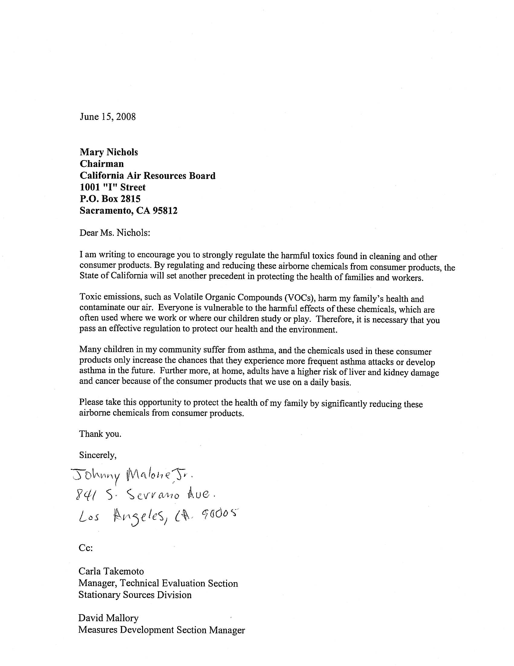 | Comment | Mary Nichols Chairman California Air Resources Board 1001 “I” Street P.O. Box 2815 Sacramento, CA 95812 Dear Chairman Nichols, I encourage you to strongly reduce the harmful toxics found in cleaning and other consumer products. By regulating and reducing these chemicals from consumer products, the State of California will set another precedent in protecting the health of families and workers. Volatile organic compounds (VOCs), harm our families’ health and contaminate our air. Everyone is vulnerable to the harmful effects of these chemicals, which are often used where we work and live and where our children study and play. Many children in our communities suffer from asthma, and the chemicals emitted by consumer products only increase the chances that they endure more frequent attacks or develop asthma in the future. Furthermore, adults may experience an increased risk of liver and kidney damage and cancer from the daily use of consumer products. As a consumer and concerned citizen, I urge the California Air Resources Board to adopt tougher regulations on consumer products. I also urge you to include additional VOC reductions from some of the worst culprits – multipurpose cleaners, degreasers and glass cleaners. Please take this opportunity to protect the health of our families by significantly reducing these air pollutants that emanate from consumer products. Thank you. |