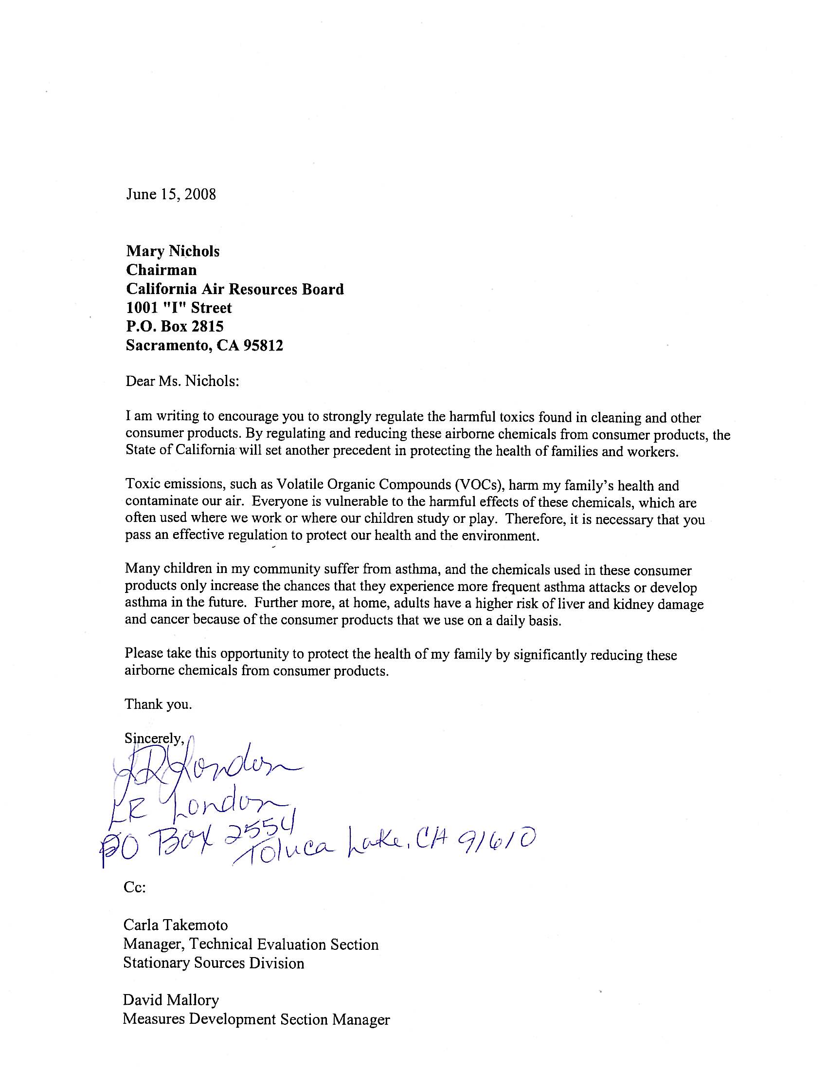 | Comment | Mary Nichols Chairman California Air Resources Board 1001 “I” Street P.O. Box 2815 Sacramento, CA 95812 Dear Chairman Nichols, I encourage you to strongly reduce the harmful toxics found in cleaning and other consumer products. By regulating and reducing these chemicals from consumer products, the State of California will set another precedent in protecting the health of families and workers. Volatile organic compounds (VOCs), harm our families’ health and contaminate our air. Everyone is vulnerable to the harmful effects of these chemicals, which are often used where we work and live and where our children study and play. Many children in our communities suffer from asthma, and the chemicals emitted by consumer products only increase the chances that they endure more frequent attacks or develop asthma in the future. Furthermore, adults may experience an increased risk of liver and kidney damage and cancer from the daily use of consumer products. As a consumer and concerned citizen, I urge the California Air Resources Board to adopt tougher regulations on consumer products. I also urge you to include additional VOC reductions from some of the worst culprits – multipurpose cleaners, degreasers and glass cleaners. Please take this opportunity to protect the health of our families by significantly reducing these air pollutants that emanate from consumer products. Thank you. |