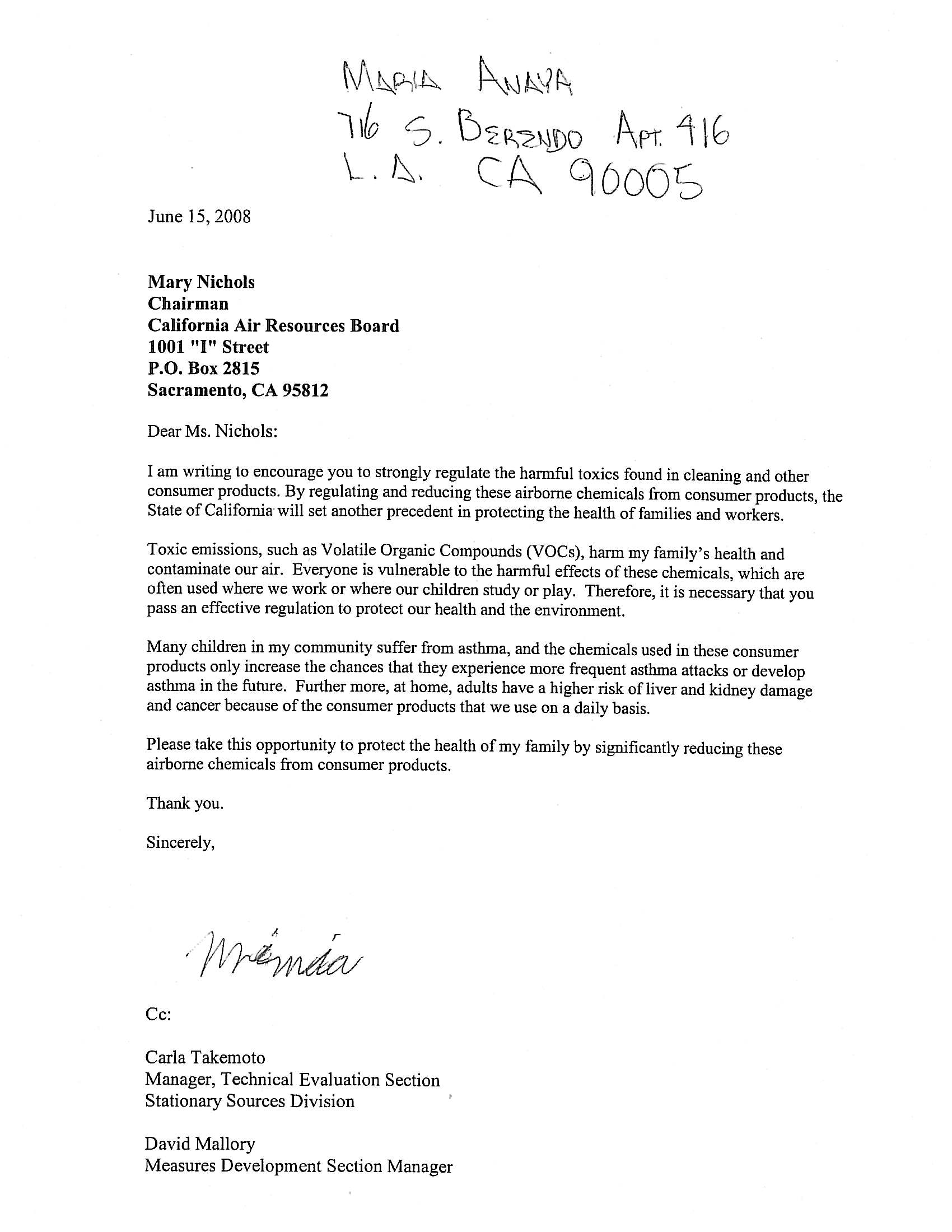| Comment | Mary Nichols Chairman California Air Resources Board 1001 “I” Street P.O. Box 2815 Sacramento, CA 95812 Dear Chairman Nichols, I encourage you to strongly reduce the harmful toxics found in cleaning and other consumer products. By regulating and reducing these chemicals from consumer products, the State of California will set another precedent in protecting the health of families and workers. Volatile organic compounds (VOCs), harm our families’ health and contaminate our air. Everyone is vulnerable to the harmful effects of these chemicals, which are often used where we work and live and where our children study and play. Many children in our communities suffer from asthma, and the chemicals emitted by consumer products only increase the chances that they endure more frequent attacks or develop asthma in the future. Furthermore, adults may experience an increased risk of liver and kidney damage and cancer from the daily use of consumer products. As a consumer and concerned citizen, I urge the California Air Resources Board to adopt tougher regulations on consumer products. I also urge you to include additional VOC reductions from some of the worst culprits – multipurpose cleaners, degreasers and glass cleaners. Please take this opportunity to protect the health of our families by significantly reducing these air pollutants that emanate from consumer products. Thank you. |