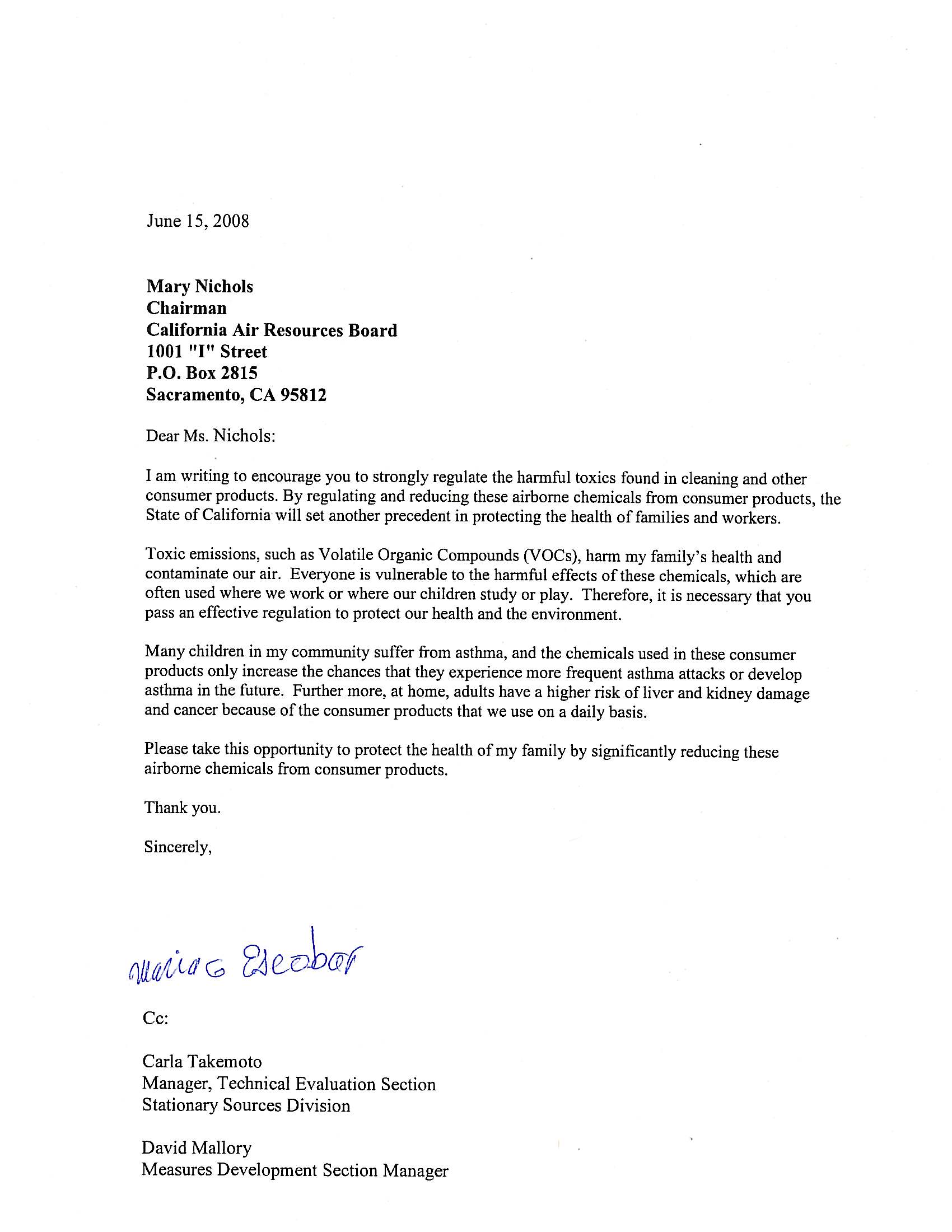 | Comment | Mary Nichols Chairman California Air Resources Board 1001 “I” Street P.O. Box 2815 Sacramento, CA 95812 Dear Chairman Nichols, I encourage you to strongly reduce the harmful toxics found in cleaning and other consumer products. By regulating and reducing these chemicals from consumer products, the State of California will set another precedent in protecting the health of families and workers. Volatile organic compounds (VOCs), harm our families’ health and contaminate our air. Everyone is vulnerable to the harmful effects of these chemicals, which are often used where we work and live and where our children study and play. Many children in our communities suffer from asthma, and the chemicals emitted by consumer products only increase the chances that they endure more frequent attacks or develop asthma in the future. Furthermore, adults may experience an increased risk of liver and kidney damage and cancer from the daily use of consumer products. As a consumer and concerned citizen, I urge the California Air Resources Board to adopt tougher regulations on consumer products. I also urge you to include additional VOC reductions from some of the worst culprits – multipurpose cleaners, degreasers and glass cleaners. Please take this opportunity to protect the health of our families by significantly reducing these air pollutants that emanate from consumer products. Thank you. |