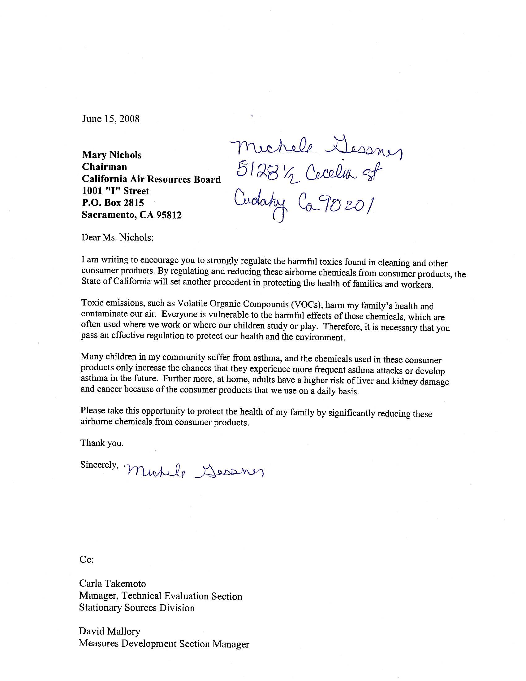 | Comment | Mary Nichols Chairman California Air Resources Board 1001 “I” Street P.O. Box 2815 Sacramento, CA 95812 Dear Chairman Nichols, I encourage you to strongly reduce the harmful toxics found in cleaning and other consumer products. By regulating and reducing these chemicals from consumer products, the State of California will set another precedent in protecting the health of families and workers. Volatile organic compounds (VOCs), harm our families’ health and contaminate our air. Everyone is vulnerable to the harmful effects of these chemicals, which are often used where we work and live and where our children study and play. Many children in our communities suffer from asthma, and the chemicals emitted by consumer products only increase the chances that they endure more frequent attacks or develop asthma in the future. Furthermore, adults may experience an increased risk of liver and kidney damage and cancer from the daily use of consumer products. As a consumer and concerned citizen, I urge the California Air Resources Board to adopt tougher regulations on consumer products. I also urge you to include additional VOC reductions from some of the worst culprits – multipurpose cleaners, degreasers and glass cleaners. Please take this opportunity to protect the health of our families by significantly reducing these air pollutants that emanate from consumer products. Thank you. |
