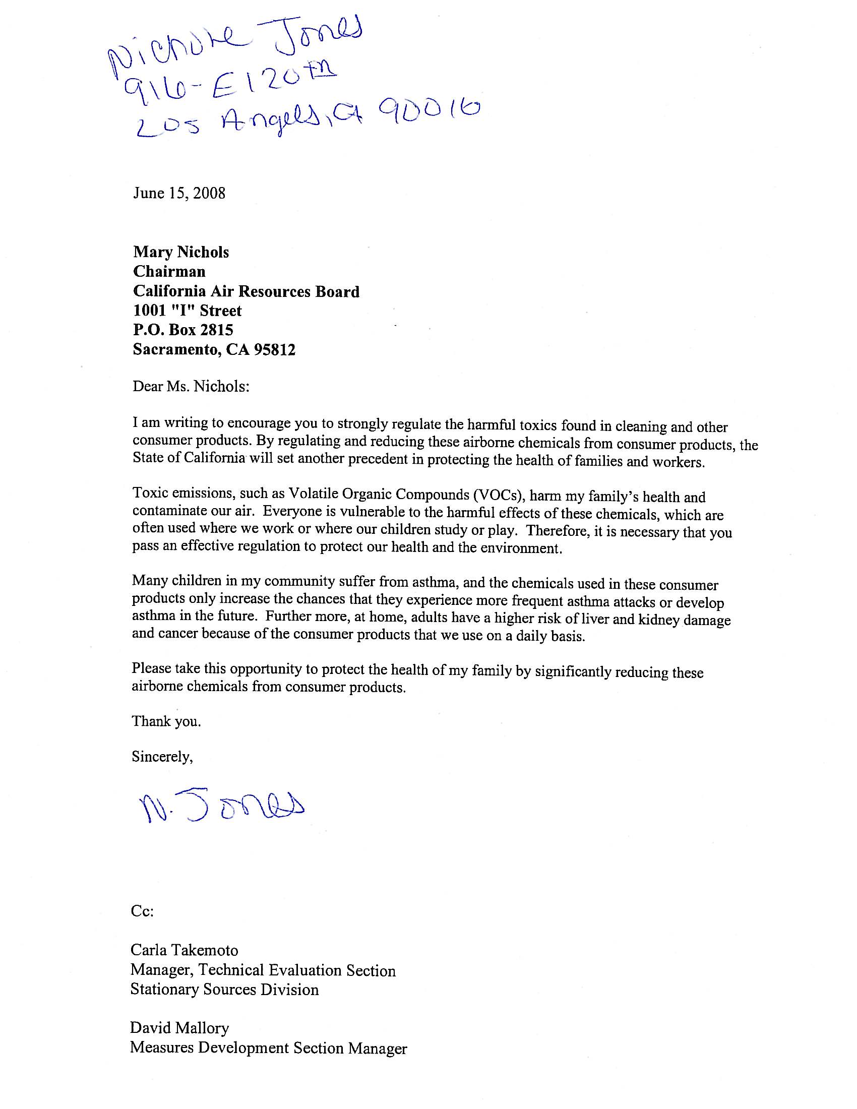 | Comment | Mary Nichols Chairman California Air Resources Board 1001 “I” Street P.O. Box 2815 Sacramento, CA 95812 Dear Chairman Nichols, I encourage you to strongly reduce the harmful toxics found in cleaning and other consumer products. By regulating and reducing these chemicals from consumer products, the State of California will set another precedent in protecting the health of families and workers. Volatile organic compounds (VOCs), harm our families’ health and contaminate our air. Everyone is vulnerable to the harmful effects of these chemicals, which are often used where we work and live and where our children study and play. Many children in our communities suffer from asthma, and the chemicals emitted by consumer products only increase the chances that they endure more frequent attacks or develop asthma in the future. Furthermore, adults may experience an increased risk of liver and kidney damage and cancer from the daily use of consumer products. As a consumer and concerned citizen, I urge the California Air Resources Board to adopt tougher regulations on consumer products. I also urge you to include additional VOC reductions from some of the worst culprits – multipurpose cleaners, degreasers and glass cleaners. Please take this opportunity to protect the health of our families by significantly reducing these air pollutants that emanate from consumer products. Thank you. |