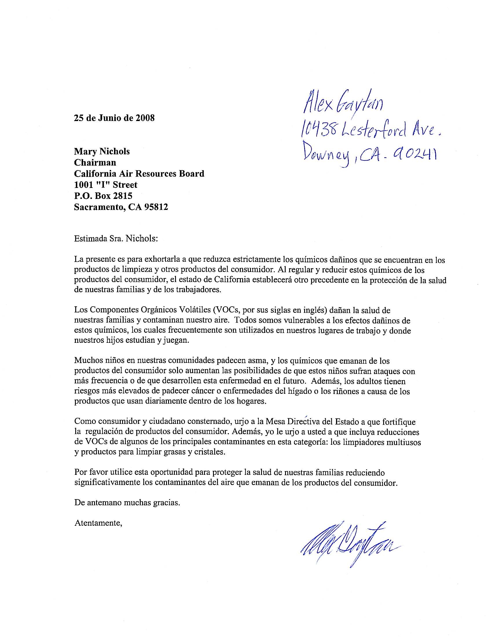 | Comment | Mary Nichols Chairman California Air Resources Board 1001 “I” Street P.O. Box 2815 Sacramento, CA 95812 Dear Chairman Nichols, I encourage you to strongly reduce the harmful toxics found in cleaning and other consumer products. By regulating and reducing these chemicals from consumer products, the State of California will set another precedent in protecting the health of families and workers. Volatile organic compounds (VOCs), harm our families’ health and contaminate our air. Everyone is vulnerable to the harmful effects of these chemicals, which are often used where we work and live and where our children study and play. Many children in our communities suffer from asthma, and the chemicals emitted by consumer products only increase the chances that they endure more frequent attacks or develop asthma in the future. Furthermore, adults may experience an increased risk of liver and kidney damage and cancer from the daily use of consumer products. As a consumer and concerned citizen, I urge the California Air Resources Board to adopt tougher regulations on consumer products. I also urge you to include additional VOC reductions from some of the worst culprits – multipurpose cleaners, degreasers and glass cleaners. Please take this opportunity to protect the health of our families by significantly reducing these air pollutants that emanate from consumer products. Thank you. |