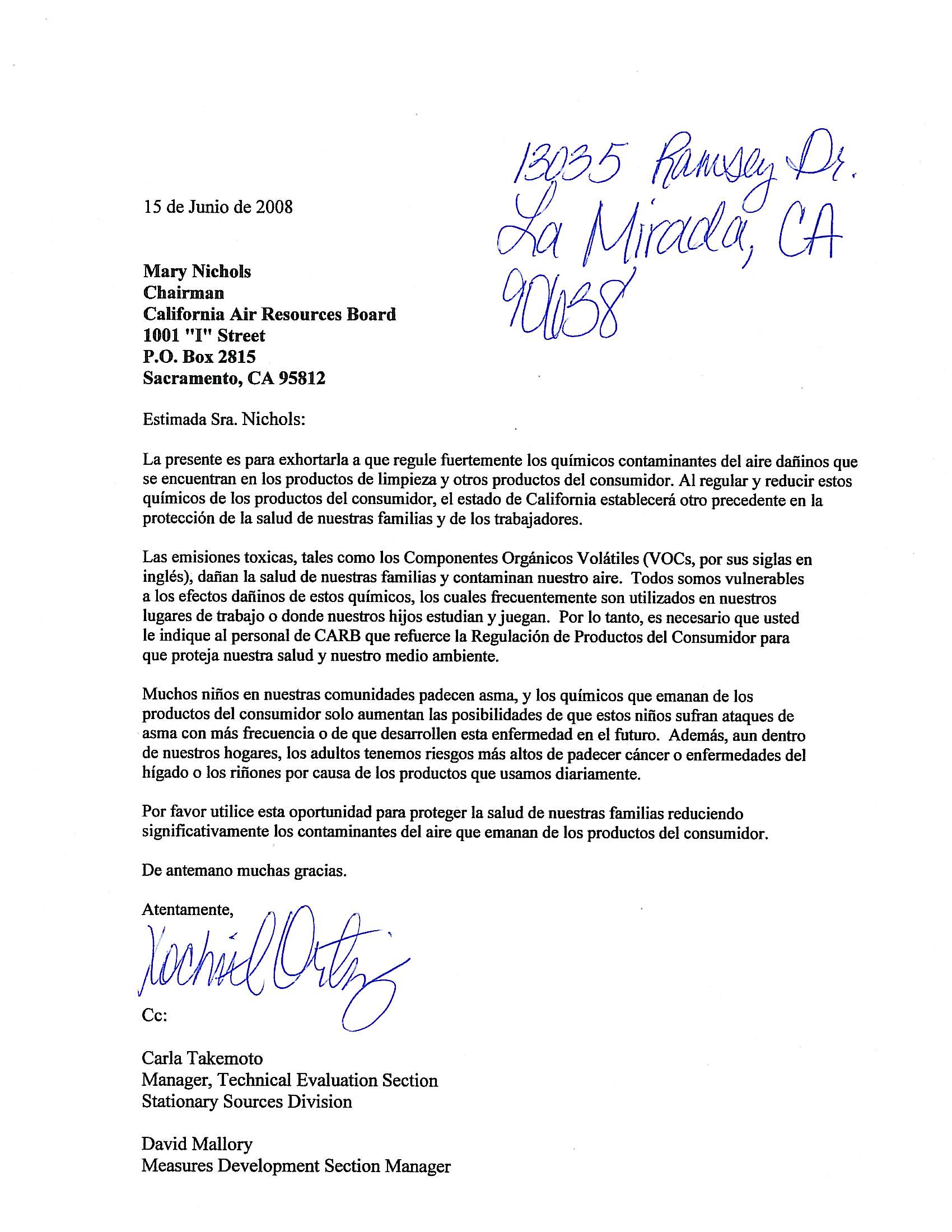 | Comment | Mary Nichols Chairman California Air Resources Board 1001 “I” Street P.O. Box 2815 Sacramento, CA 95812 Dear Chairman Nichols, I encourage you to strongly reduce the harmful toxics found in cleaning and other consumer products. By regulating and reducing these chemicals from consumer products, the State of California will set another precedent in protecting the health of families and workers. Volatile organic compounds (VOCs), harm our families’ health and contaminate our air. Everyone is vulnerable to the harmful effects of these chemicals, which are often used where we work and live and where our children study and play. Many children in our communities suffer from asthma, and the chemicals emitted by consumer products only increase the chances that they endure more frequent attacks or develop asthma in the future. Furthermore, adults may experience an increased risk of liver and kidney damage and cancer from the daily use of consumer products. As a consumer and concerned citizen, I urge the California Air Resources Board to adopt tougher regulations on consumer products. I also urge you to include additional VOC reductions from some of the worst culprits – multipurpose cleaners, degreasers and glass cleaners. Please take this opportunity to protect the health of our families by significantly reducing these air pollutants that emanate from consumer products. Thank you. |